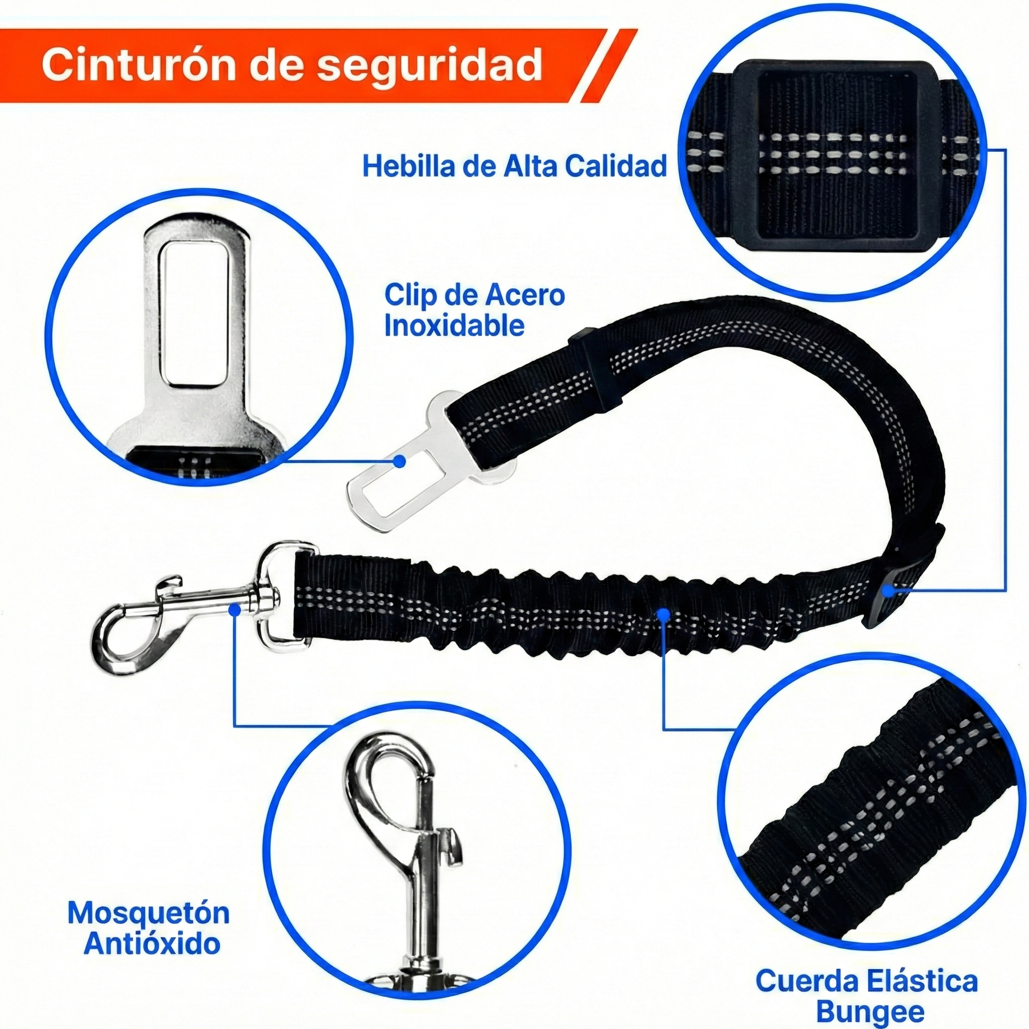 Equipado con un mosquetón de rotación 360° que evita nudos peligrosos, permitiendo que tu mascota cambie de posición sin enredarse. Su enganche de "clic" rápido es compatible con todos los modelos de coche, asegurando una conexión inmediata y sin complicaciones en cada salida.